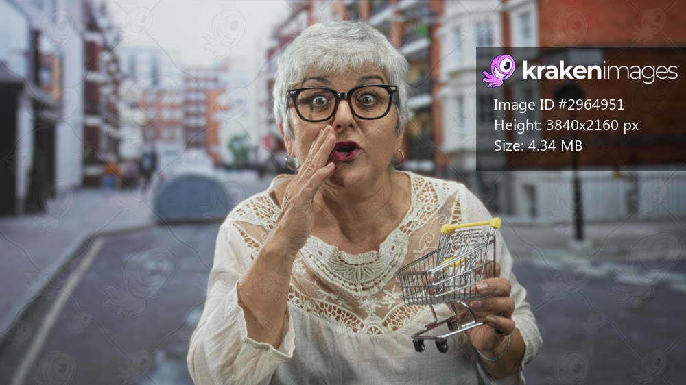 Woman with grey hair wearing glasses and a lace blouse holding a miniature shopping cart while cupping hand to mouth on a street; surprise curiosity.
