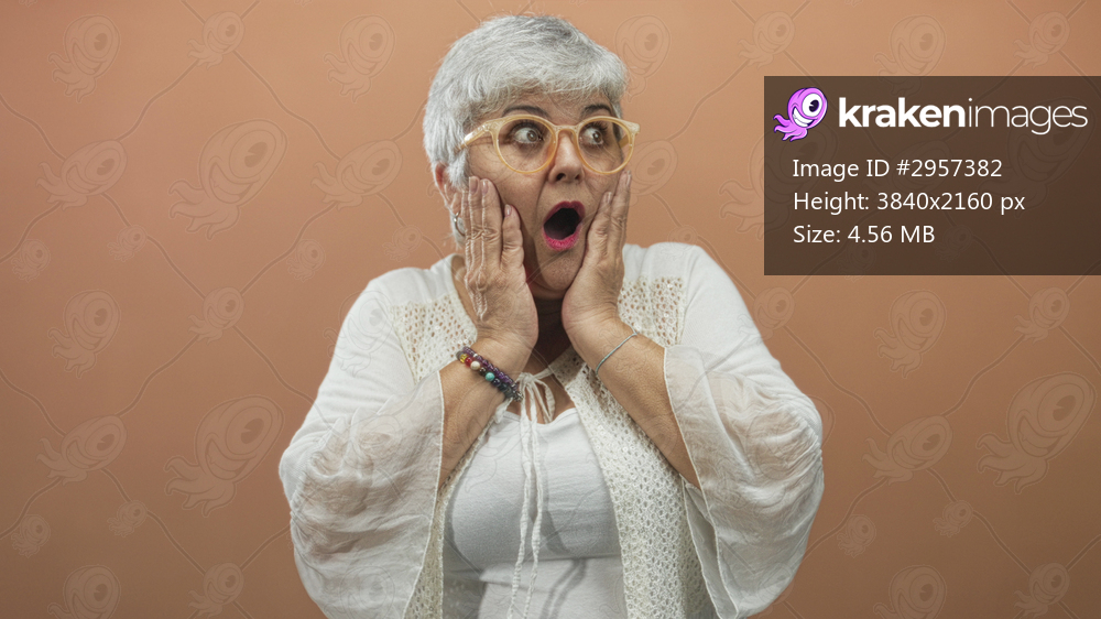 Woman with grey hair wearing large glasses presses hands to cheeks, mouth open in shock in studio with plain backdrop; surprise.
