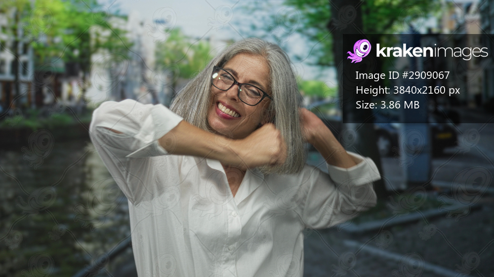 Woman with grey hair wearing white shirt and glasses with arms raised on street in amsterdam; joy celebration.