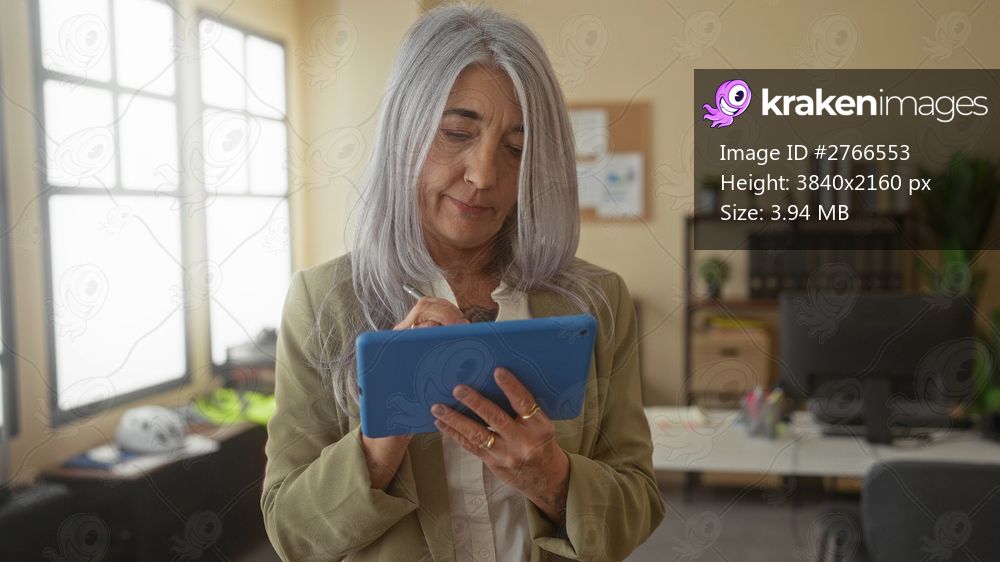 Woman with grey hair working on tablet in modern office setting with plants and shelves in background, reflecting focus and productivity.