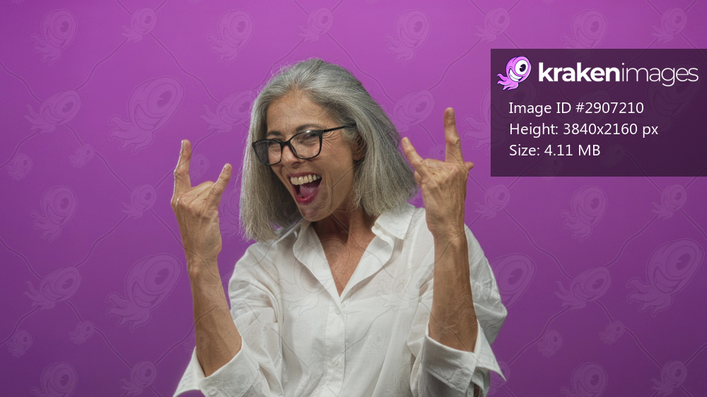 Woman grey haired flashing rock horns with bare hands and glasses in studio against purple backdrop; playful empowerment.