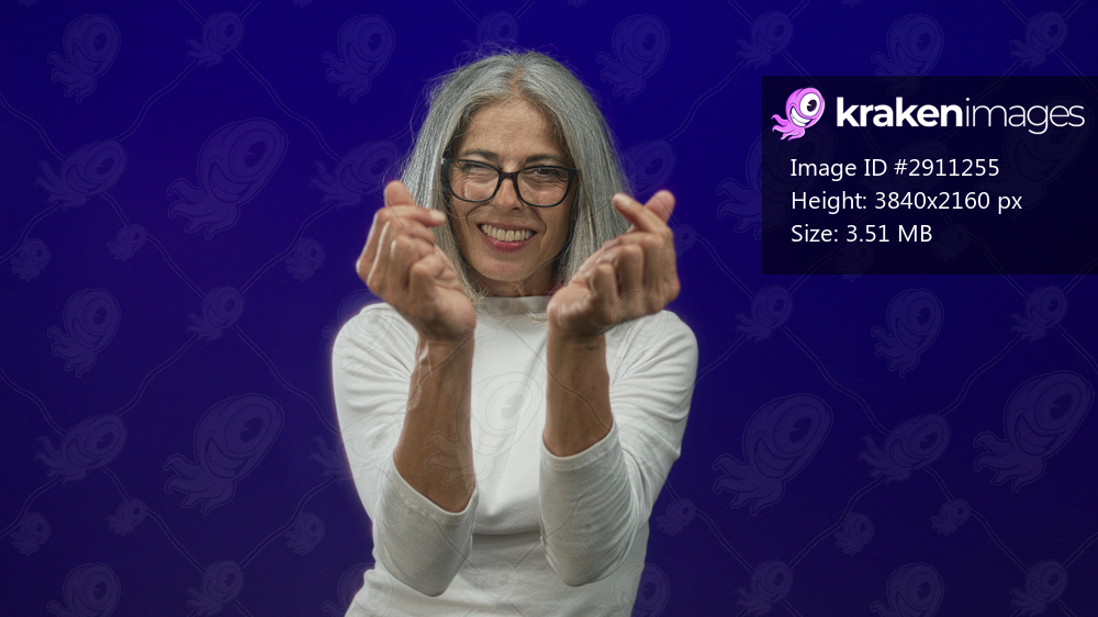 Woman grey haired forming finger heart gesture with hands in studio against purple wall; joy connection.