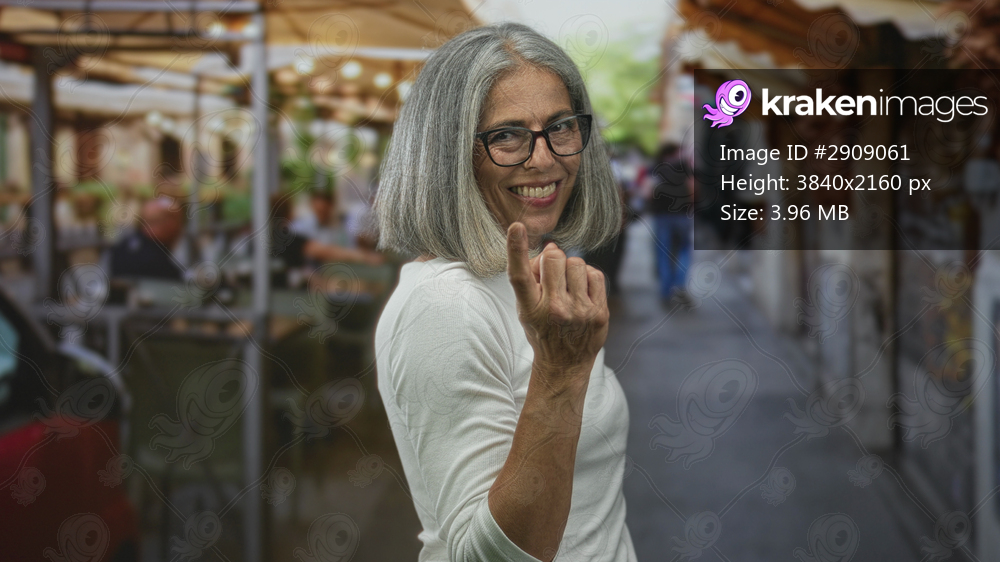 Woman grey haired middle aged wearing glasses beckoning with hand and forearm visible at outdoor restaurant terrace on a busy street; playful invitation. - Kraken Images