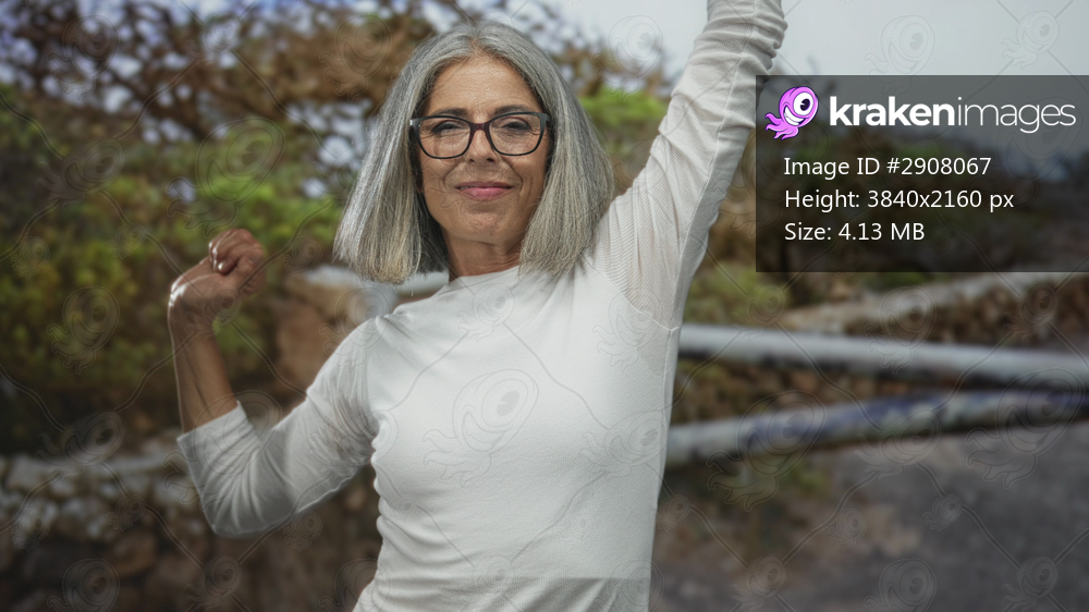 Woman grey haired stretching with hands on neck and raised arms in forest park while smiling gently; relaxation calm.