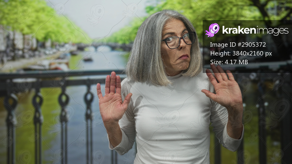 Woman grey haired wearing glasses raising both hands with palms out on a street bridge in amsterdam; surprise hesitation.