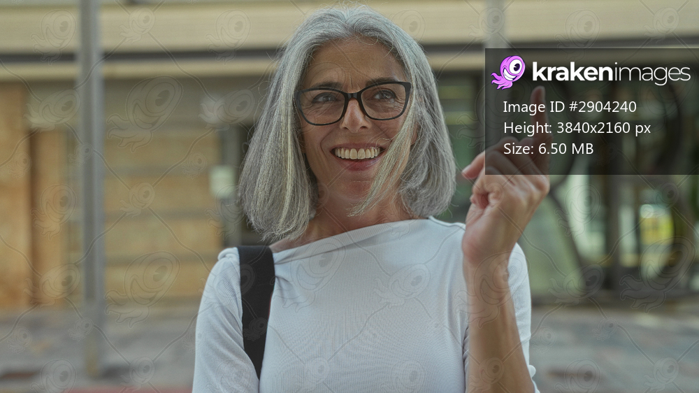 Woman grey haired wearing glasses shows middle finger on a city street carrying a shoulder bag strap; defiance boldness.