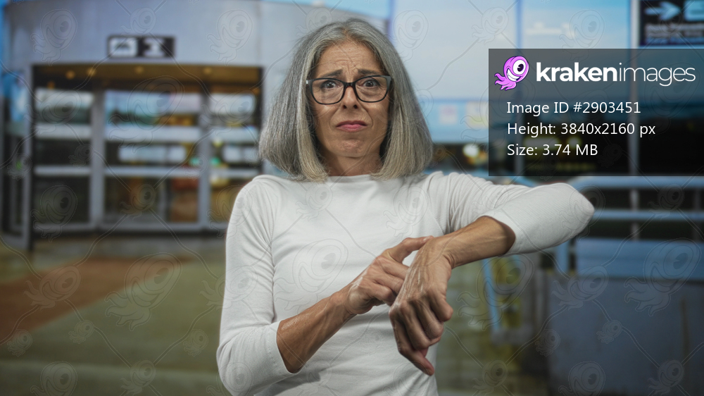 Woman grey haired wearing glasses and white shirt points finger to wrist at airport terminal while frowning and shrugging; impatience.