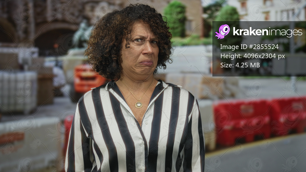 Woman grimaces at red barrier and striped shirt stands amid blurred construction equipment on street during sunny daylight; inner frustration.