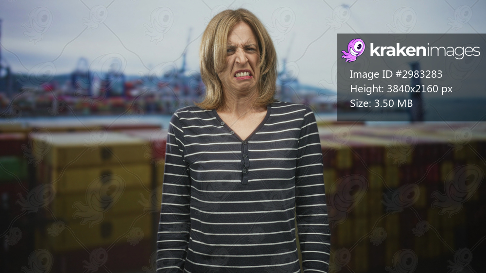 Woman grimaces beside stacked shipping containers at an industrial port terminal by the sea, wearing a striped top; disgust aversion.
