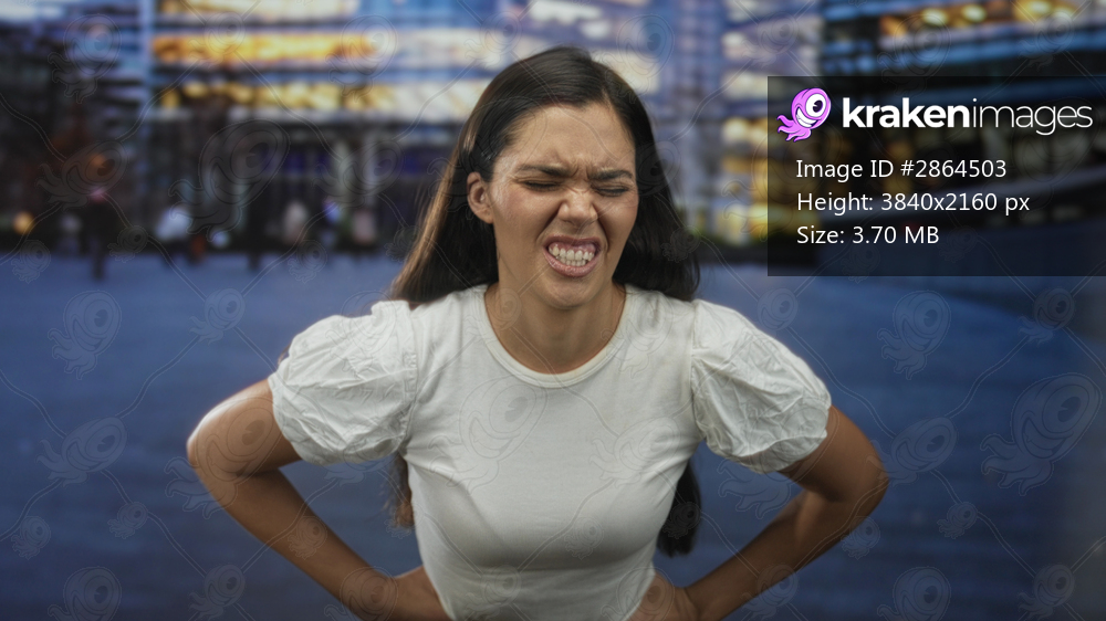 Woman grimaces and holds stomach with both hands on street in front of modern glass building under city lights; pain.
