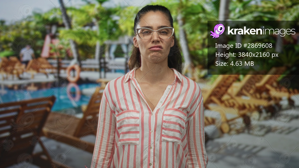 Woman grimaces with scrunched face by the outdoor hotel pool lined with wooden loungers and framed by palm trees; disgust.
