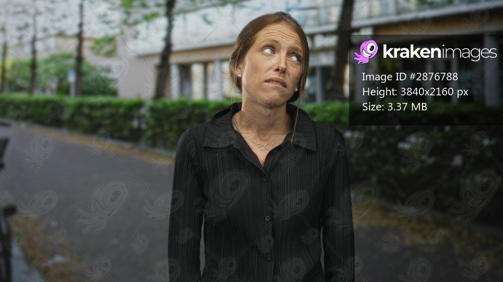 Woman grimaces with visible face and tilted head while standing on a city street in front of a building, wearing black blouse; annoyance.
