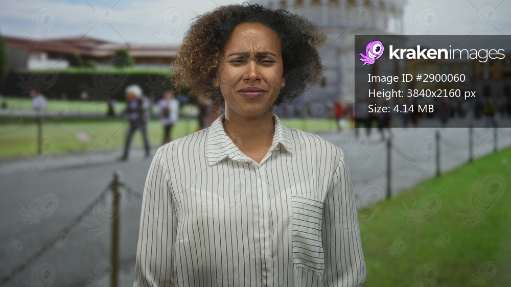 Woman grimacing with eyes closed wearing striped shirt standing before the leaning pisa tower building with tourists behind; discomfort travel.