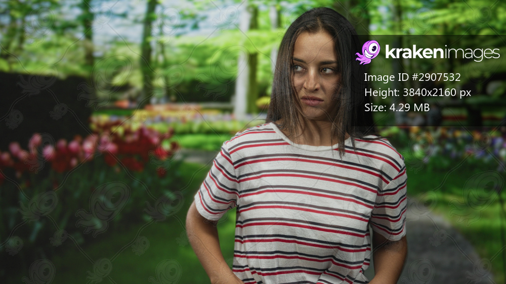 Woman grimacing face with hands on hips in forest among tulips and walking path, striped tshirt visible; disgust.