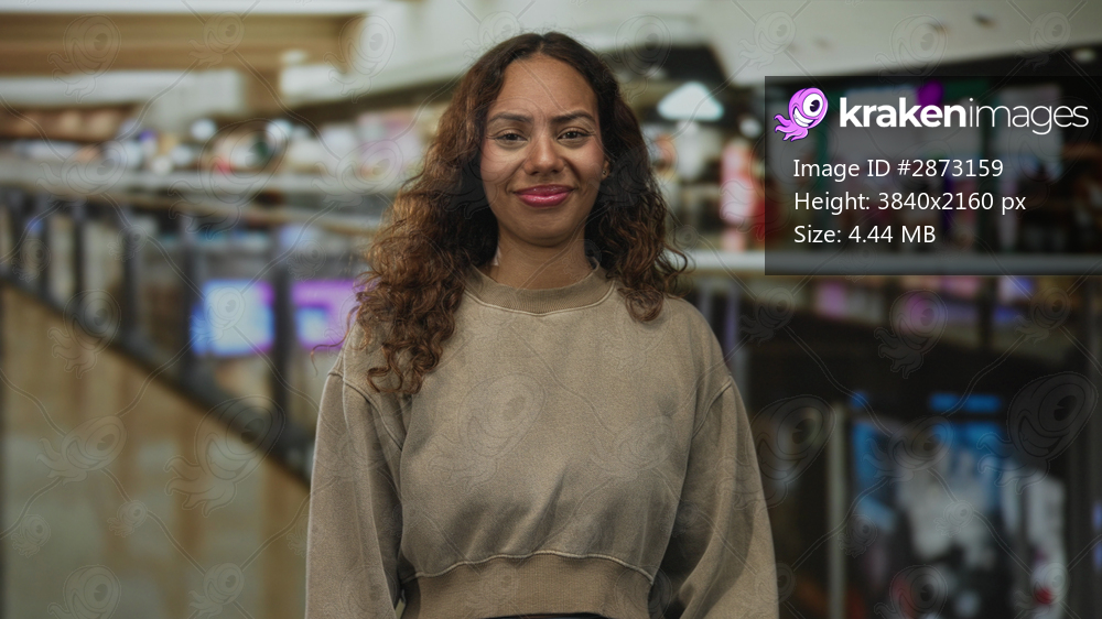 Woman grimacing, face scrunched and eyes closed while wearing cropped sweatshirt in a mall building with railings and stores visible; discomfort.