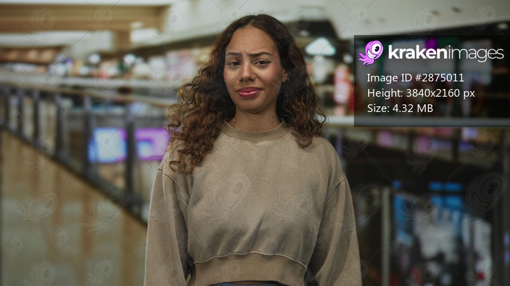 Woman grimacing, face scrunched and eyes closed while wearing cropped sweatshirt in a mall building with railings and stores visible; discomfort.