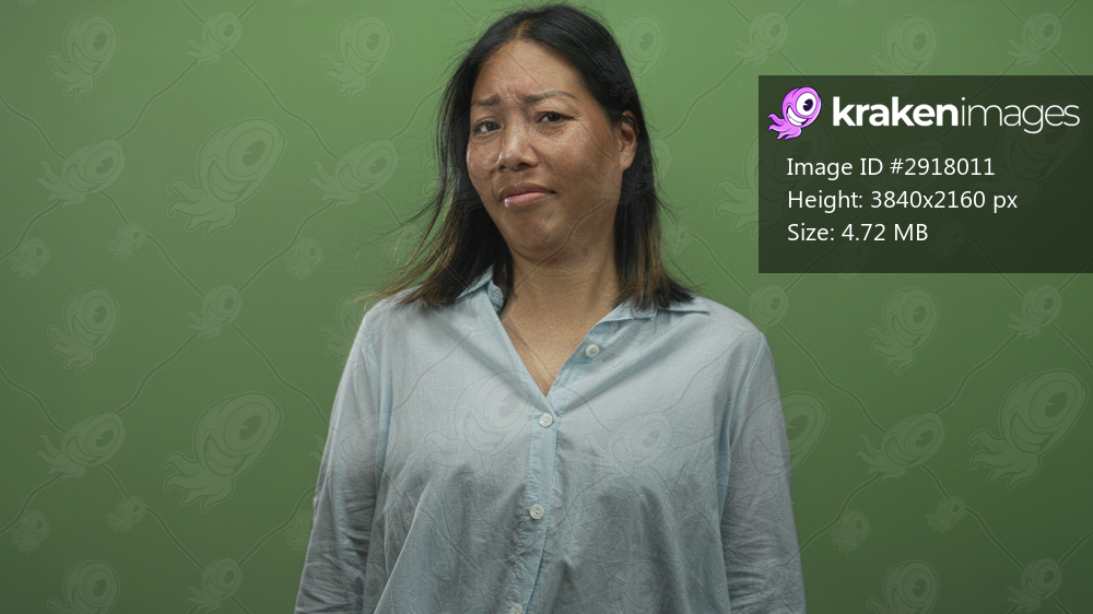 Woman grimacing with face scrunched, light blue shirt visible while standing against a green studio wall; disgust.