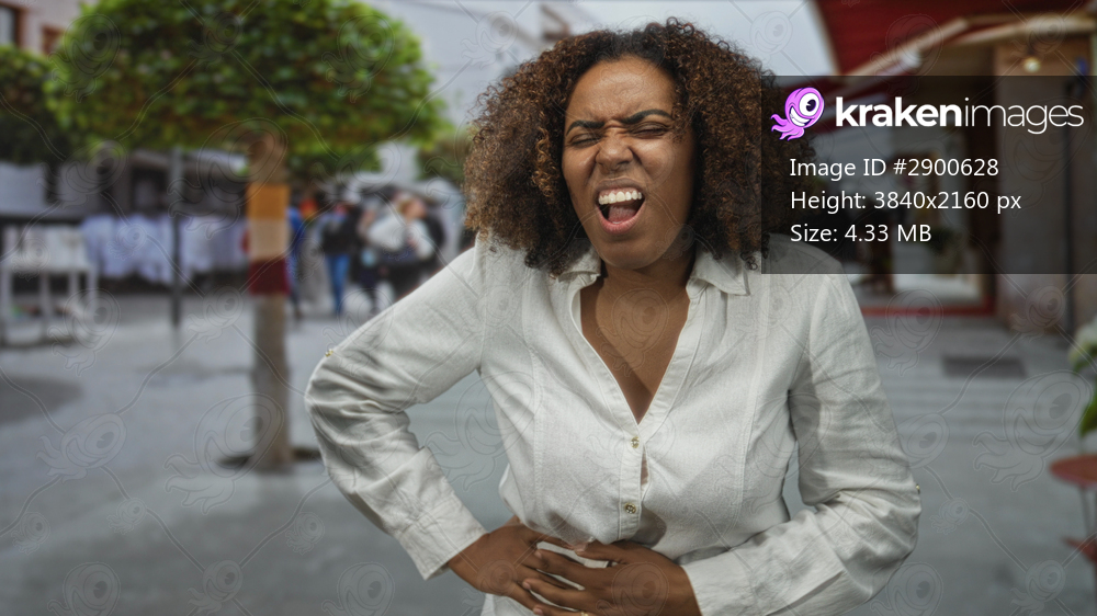 Woman grimacing with hands on hips in a crowded city street wearing white shirt, leaning forward toward camera; playful confidence.