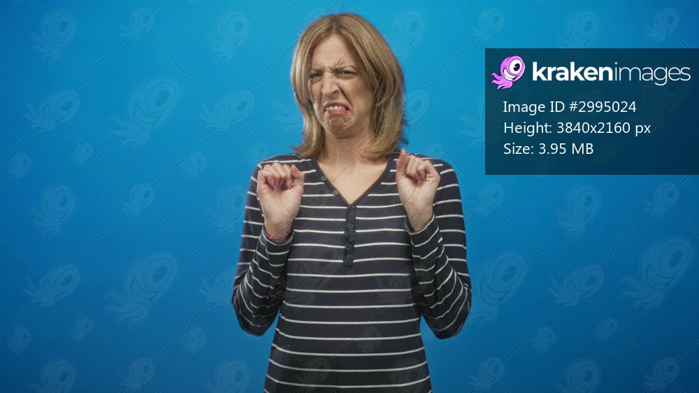 Woman grimacing with hands raised, fingers splayed and pulling at striped shirt against blue studio backdrop, visible disgust gesture; disgust rejection. - Kraken Images