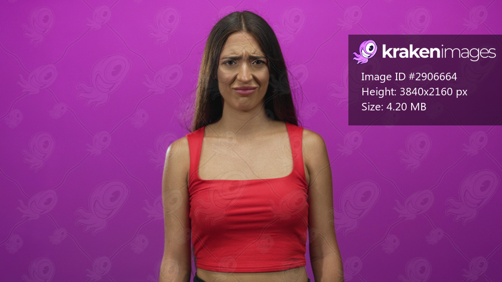 Woman grimacing in red crop top and bare shoulders in magenta studio, facing camera with frown and squint; disgust unease.