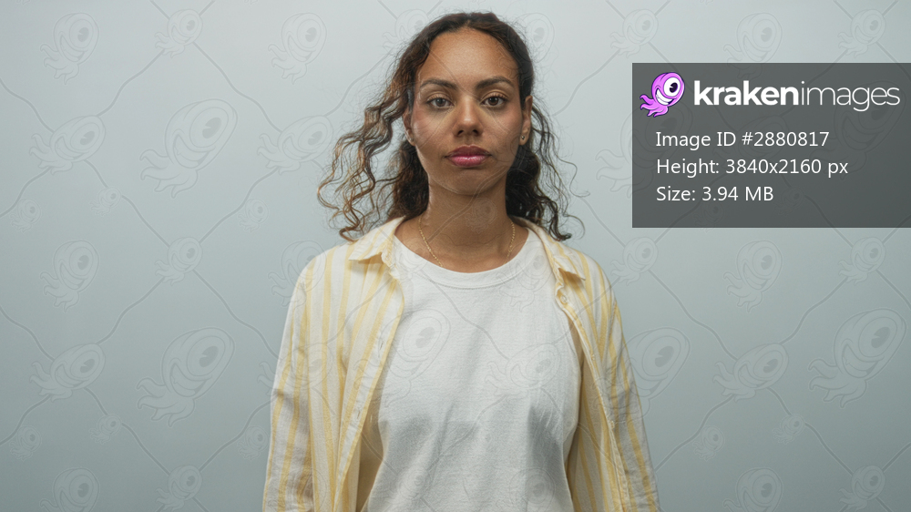 Woman grimacing showing face and shoulders, wearing yellow striped shirt and white t shirt in studio with pale blue backdrop; unease reflection.