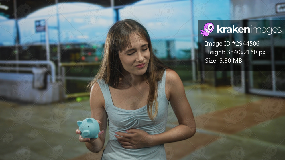 Woman grimacing while holding blue piggy bank and clutching stomach outside airport terminal entrance with glass doors; financial anxiety.