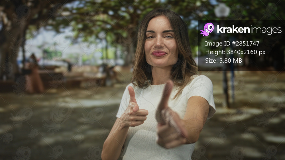Woman grins and makes dual finger pointing gesture in forest under dappled sunlight; playful energy.