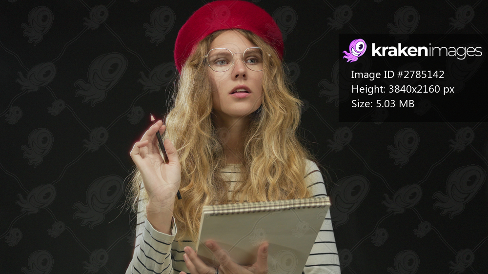 Woman grips a pencil for drawing in a studio scene with a blonde young artist holding a sketchpad in a thoughtful pose that highlights creativity in modern portrait. - Kraken Images