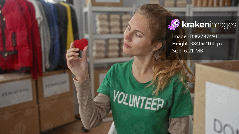 Woman grips heart before holding collection bin in charity volunteer donation center smiling beside blonde young teammates.