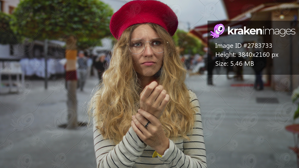 Woman grips wrist clutching on a street wearing a blonde young beret, glasses, striped top and watch.