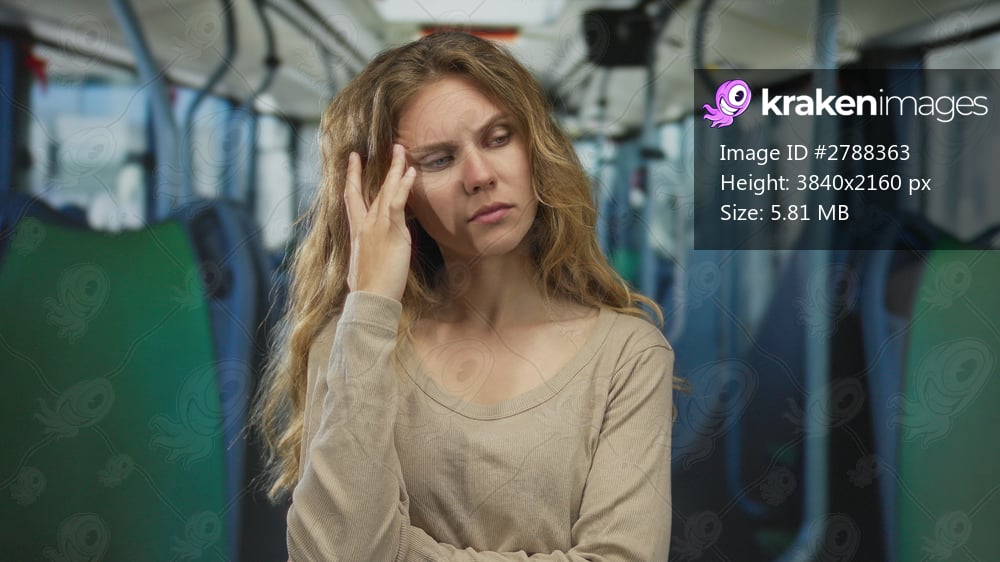 Woman hair touching bus blonde young pensive transport interior seat framed in a cinematic portrait.