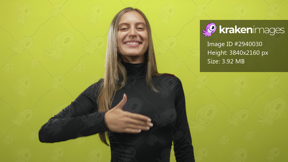 Woman with hand across chest and raised arm making gesture in green studio; confidence empowerment growth.