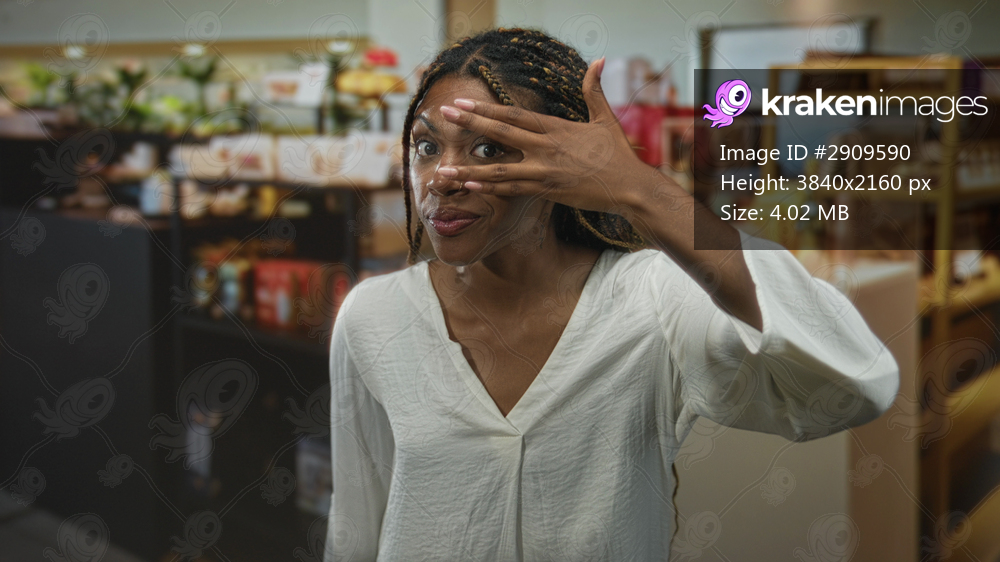 Woman hand covering eye gesture in shop building with white blouse, braided hair and visible nails; curiosity discovery.