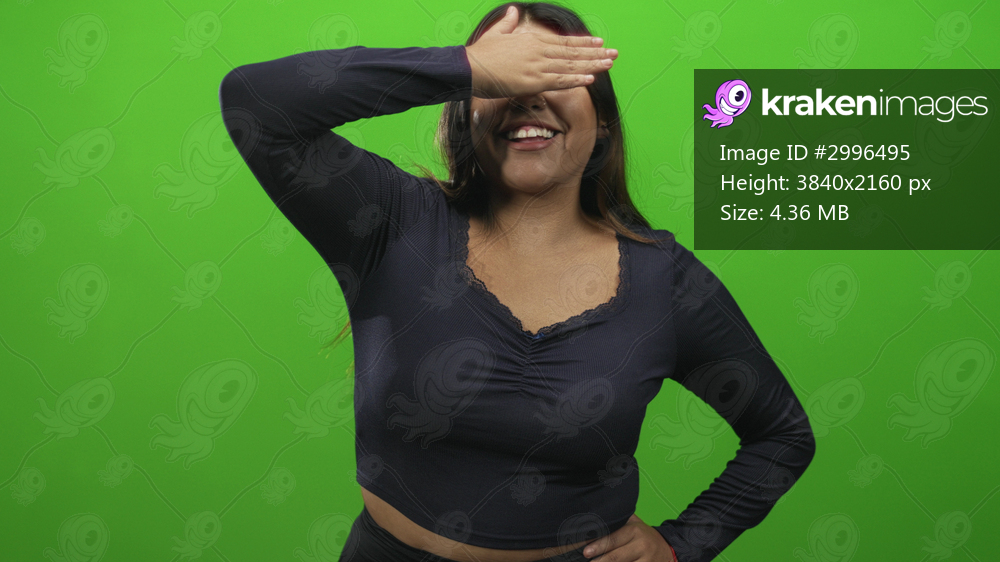 Woman hand covering eyes smiling in studio green screen, cropped shirt and exposed midriff visible; playful shyness.