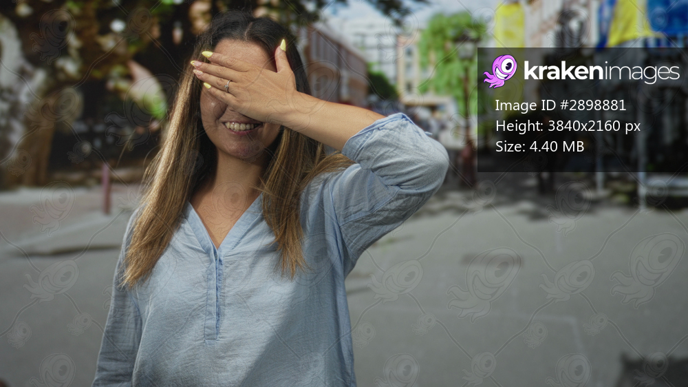 Woman with hand covering eyes, yellow nails and ring, smiling in a sunlit city street wearing a light blue blouse and casual shirt; playful joy.