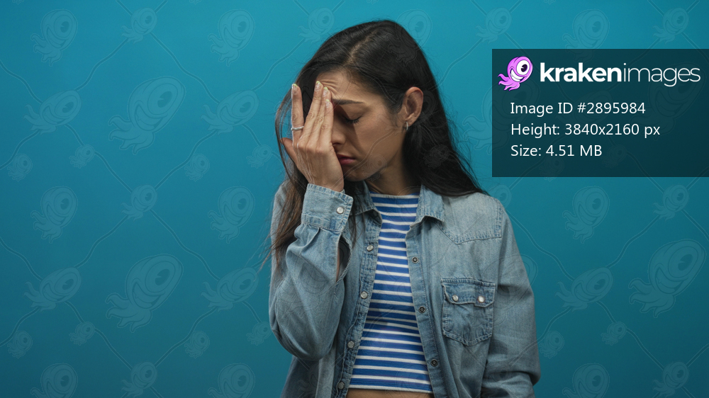 Woman with hand covering face and closed eyes, denim shirt and striped top, standing in studio with teal blue backdrop; stress recovery.