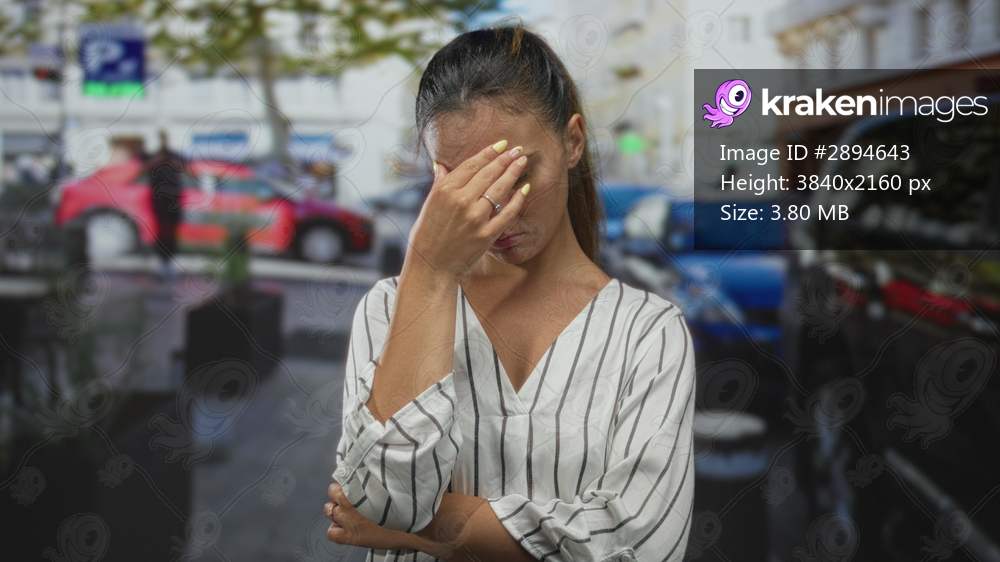Woman with hand covering forehead on street beside parked cars and planters in a city outdoors scene; frustration fatigue.