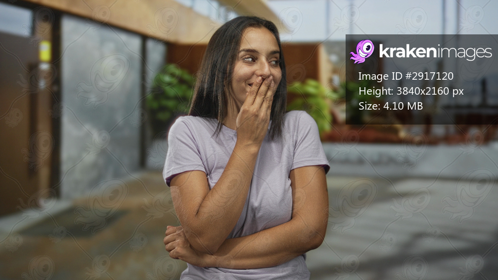 Woman with hand covering mouth and crossed arms at building entrance in casual t shirt and relaxed pose; shyness comfort.