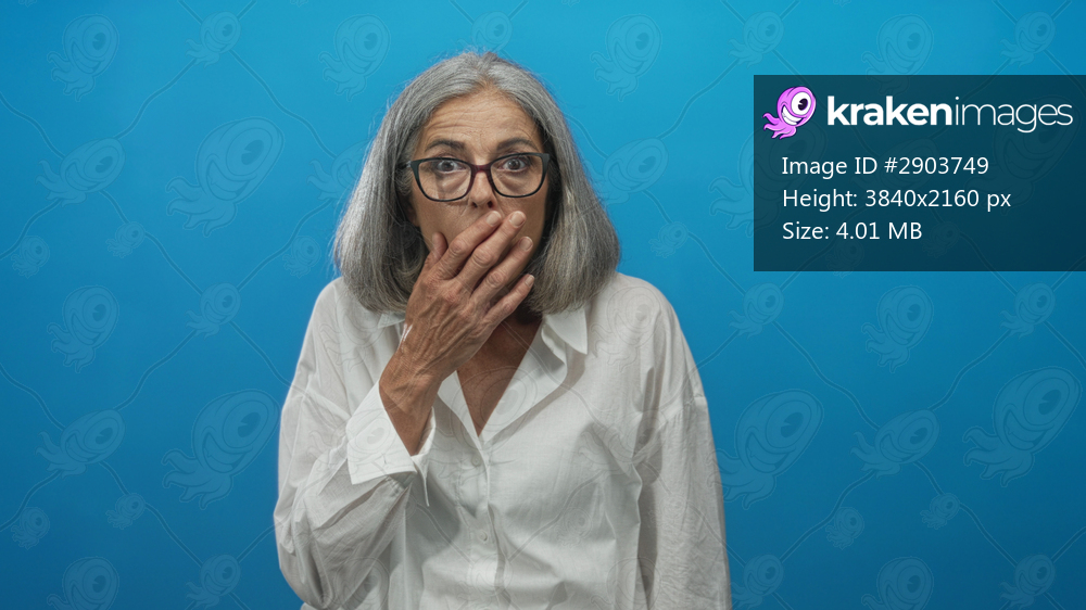 Woman with hand covering mouth and glasses wearing white shirt in blue studio near center frame, visible hand gesture; surprise aging authenticity.