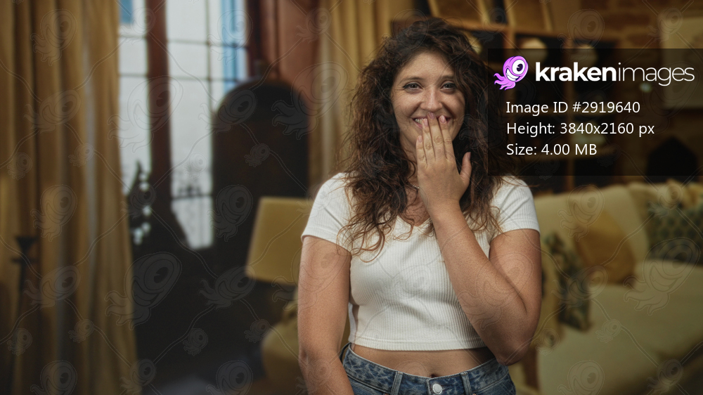 Woman with hand covering mouth laughing, standing near sofa and lamp in a living room inside a building; shyness.