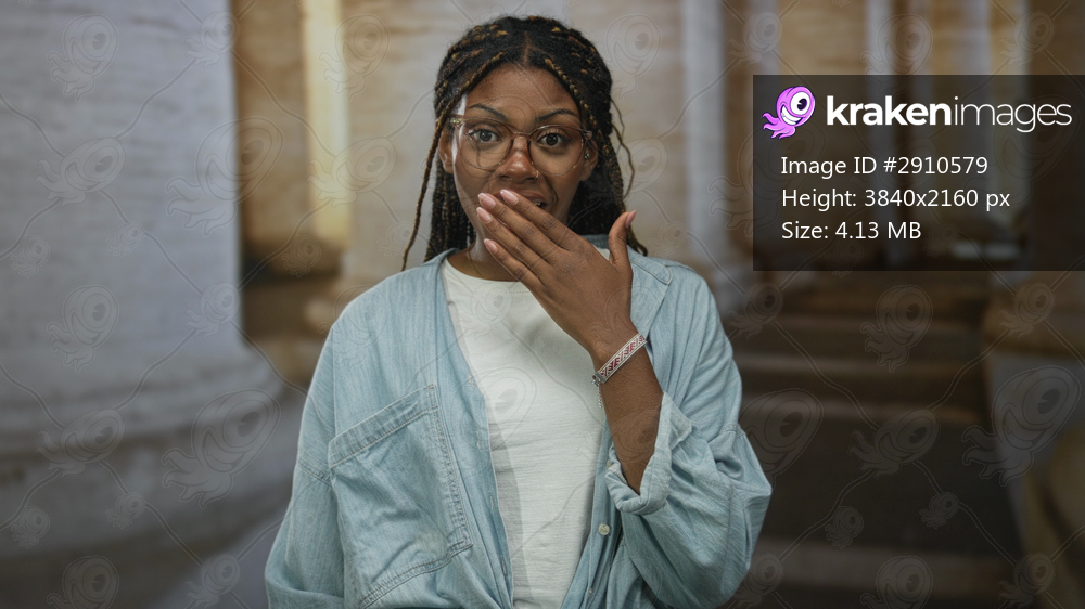 Woman with hand covering mouth and light denim shirt standing among stone columns of an old town building; surprise wonder.