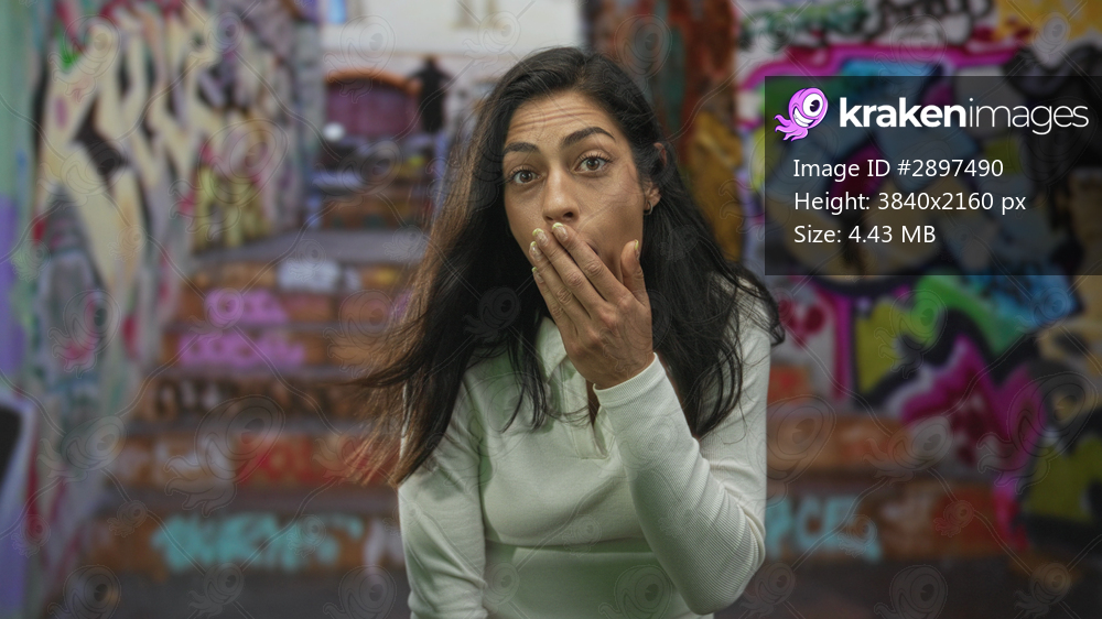 Woman with hand covering mouth on graffiti street stairs wearing white top, windblown hair and direct gaze; surprise curiosity independence.