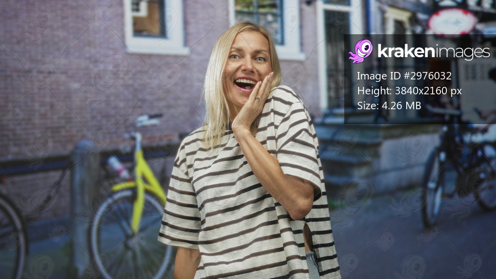 Woman with hand covering mouth showing surprised expression on a city street with bicycles and brick building; astonishment candid moment.