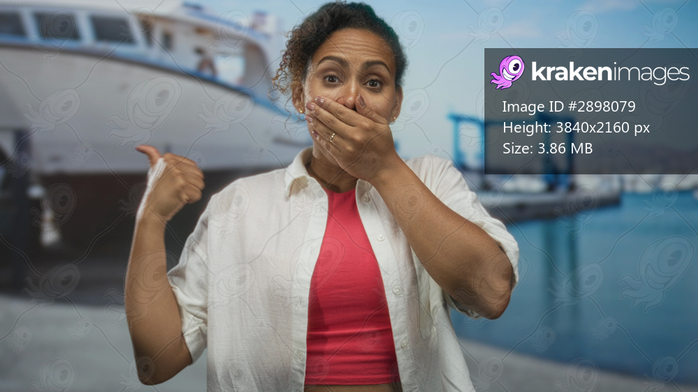 Woman with hand covering mouth and thumb pointing to boat on a street pier by the seaside; surprise.