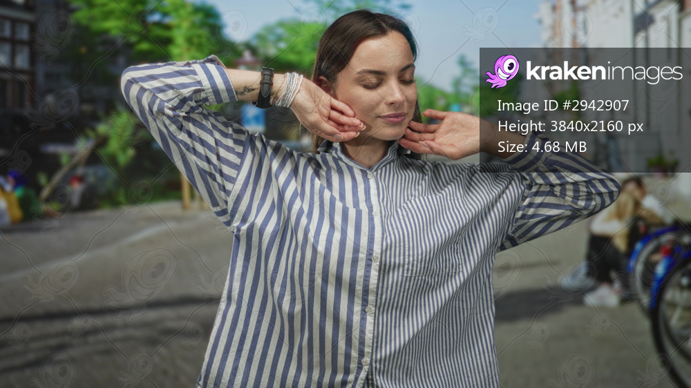 Woman with hand covering mouth yawning and eyes closed on a busy street with bicycles and blurred pedestrians in daytime; tired.