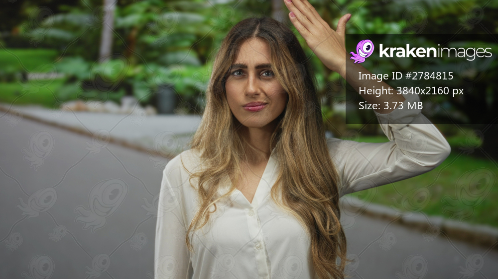 Woman hand covers eyes in park; shyness secrecy privacy mystery.