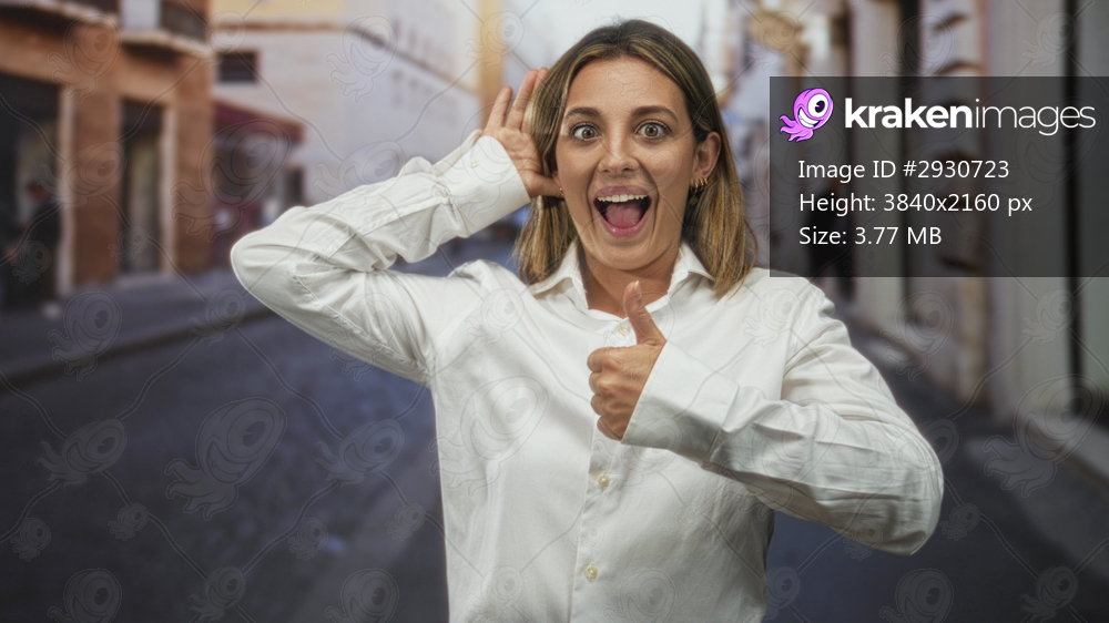 Woman with hand cupped to ear and mouth open on a city street wearing a white shirt, leaning forward as if listening intently; surprise curiosity.