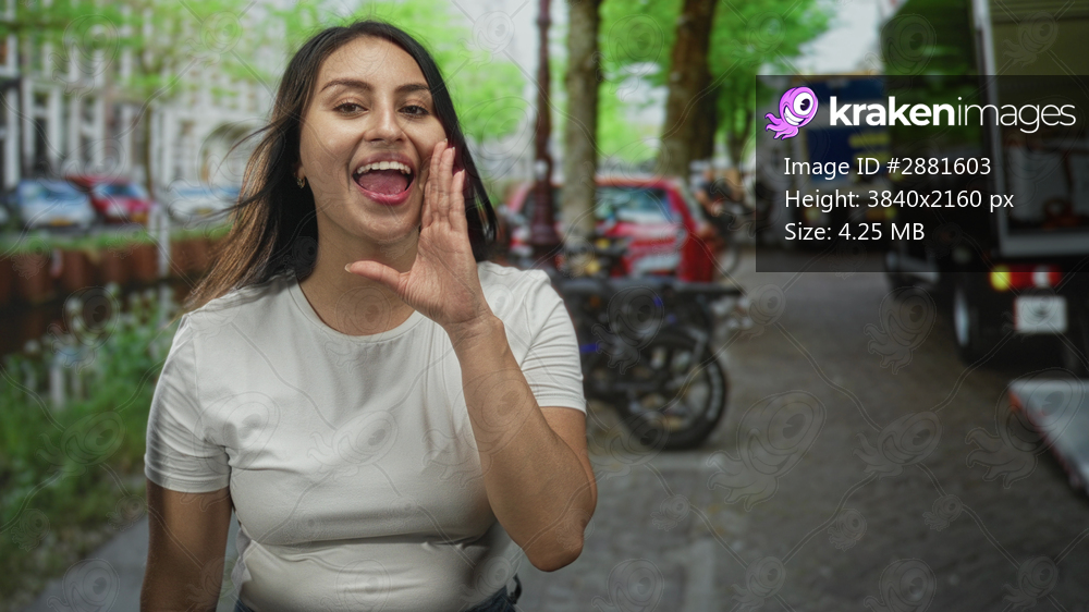 Woman with hand cupped to mouth shouting on street among parked bikes and delivery trucks; joy connection.