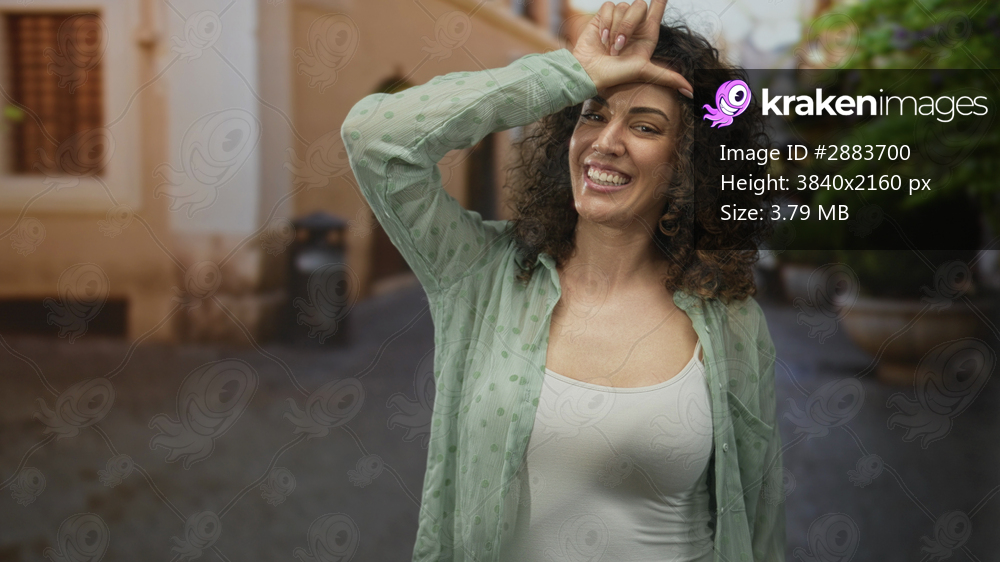 Woman with hand forming l on forehead smiling on a cobblestone street by a building and potted trees; playful confidence.