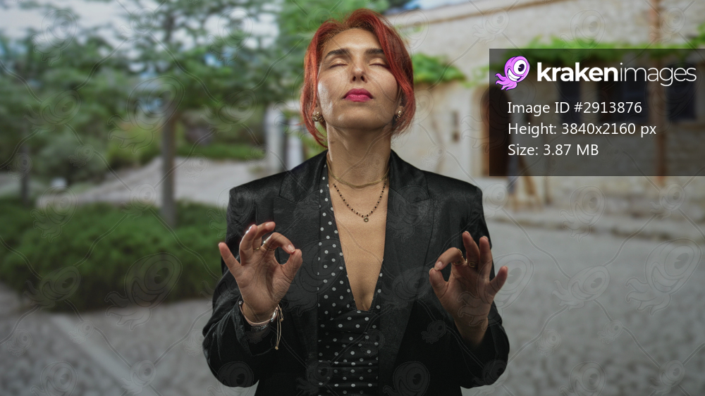 Woman with hand forming ok sign on a cobblestone street in front of a stone building, palms raised and eyes closed in still pose; serenity meditation.
